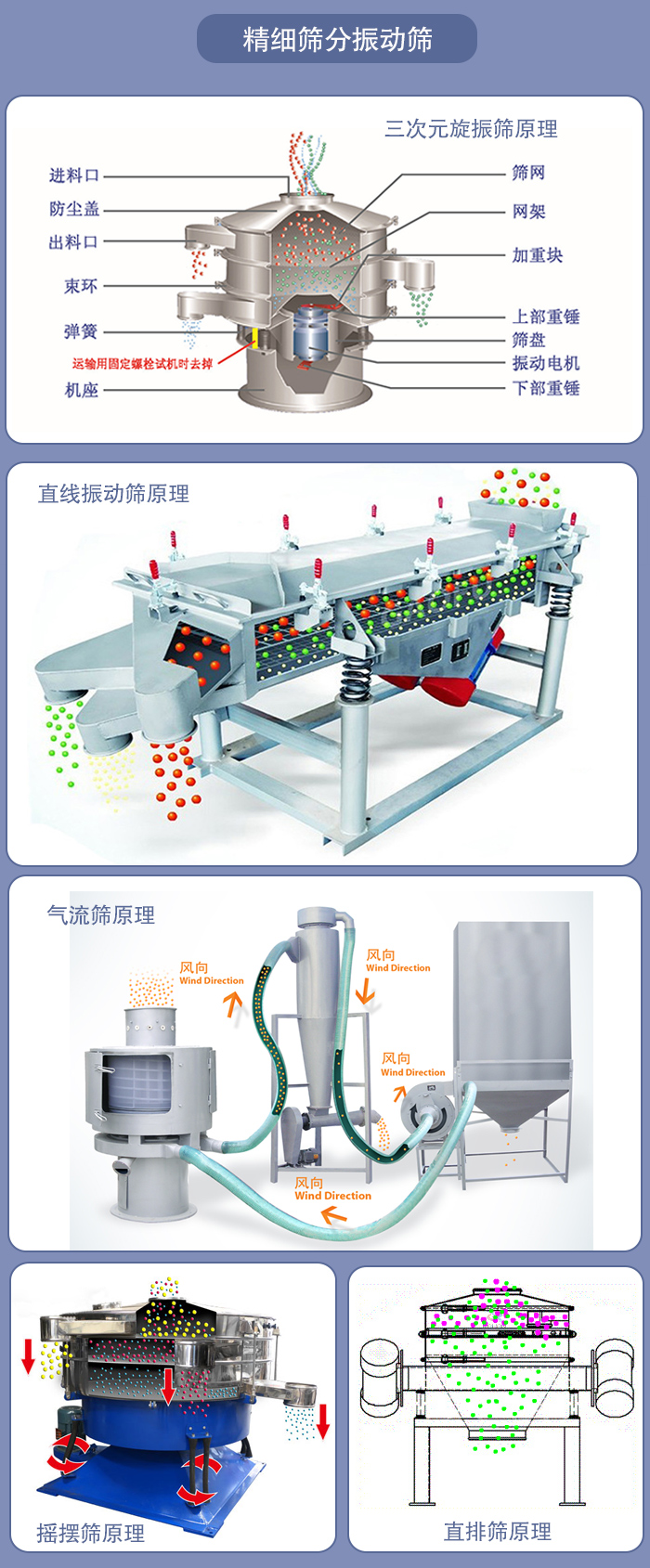 直排篩的原理是通過振動源的作用使物料在篩面做三維運動,這種運動方式可以使結塊物料散開,快速的通過篩網。精細物料直接由下部排出,雜物粗料則通過排渣出料口排出。