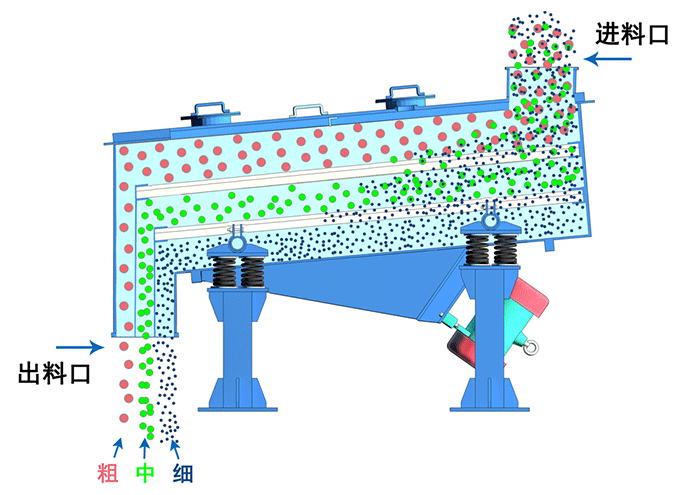 直線篩依靠?jī)蓚€(gè)相同頻率的反向電機(jī)使物料在篩面上直線向前跳躍,小于篩孔孔徑的物料通過(guò)篩網(wǎng)落入下層,將原本雜亂無(wú)章的顆粒分離,即按粒度分層,形成底部小顆粒、頂部粗顆粒的排列,從而達(dá)到對(duì)物料進(jìn)行篩分和分級(jí)的目的