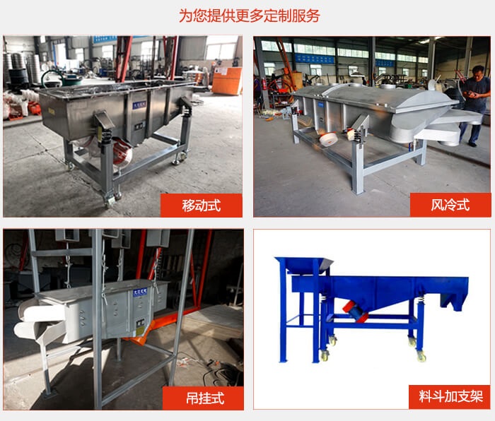 直線篩選機可根據要求采用不同的設計,如篩機的總高度、進料口角度/尺寸、出料口角度/尺寸/加閥、設備表面處理可選擇拋光或噴砂、普通電機/防爆電機等。不同設計,價格不同。