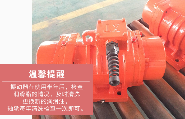 4、大漢機械溫馨提醒:振動器在使用半年后,檢查潤滑脂的情況,如發(fā)現(xiàn)變干或者有硬塊時,及時清洗更換新的潤滑油,軸承每年清洗檢查一次即可。