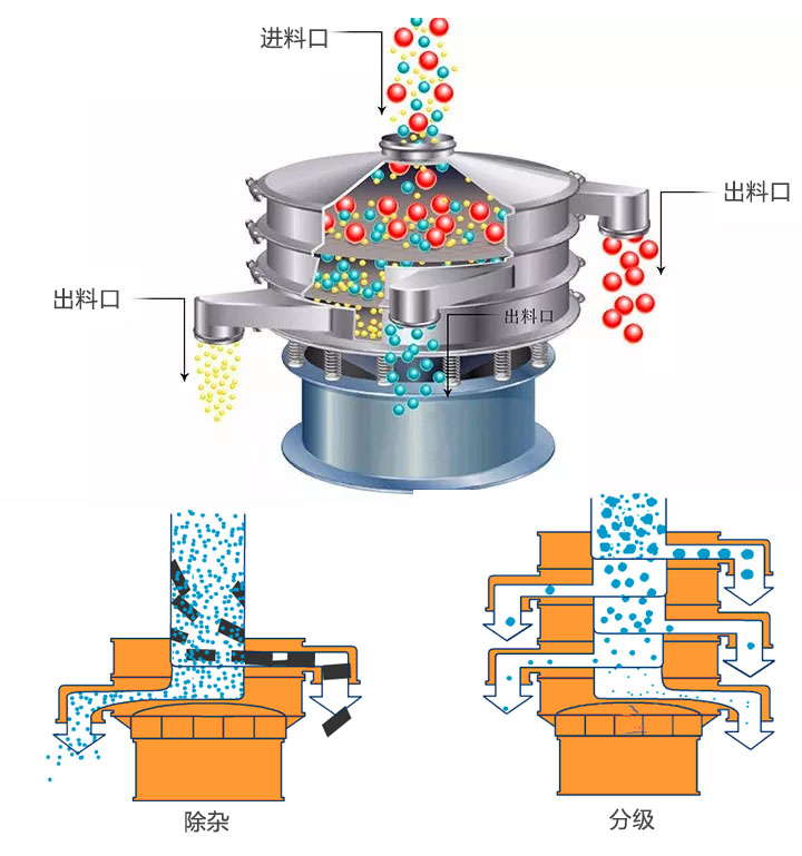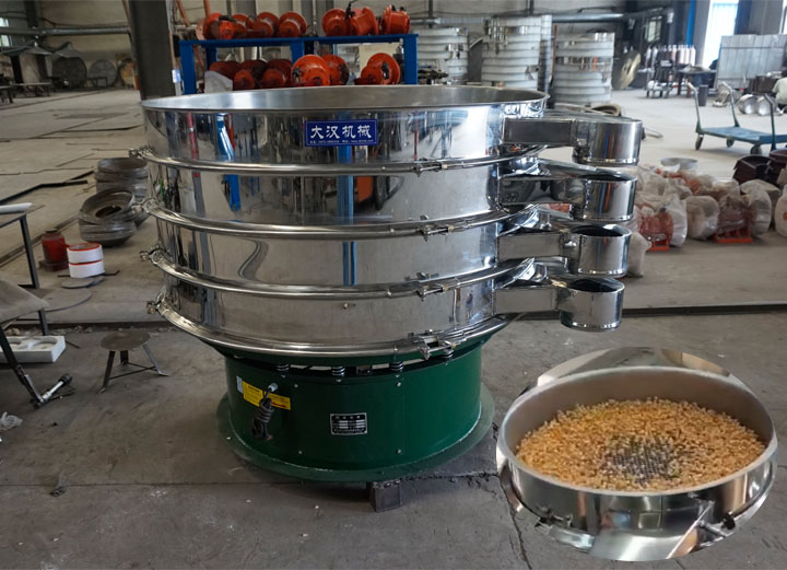 將速凍玉米倒入篩機(jī)中,在振動(dòng)電機(jī)的作用下,速凍玉米在篩面上由中間向四周擴(kuò)散,期間,速凍玉米根據(jù)粒度通過(guò)篩網(wǎng),大于篩網(wǎng)尺寸的速凍玉米將停留在篩面上并從出料口排出,小于篩孔的速凍玉米將進(jìn)入下層篩網(wǎng)繼續(xù)篩分,直至被排出。